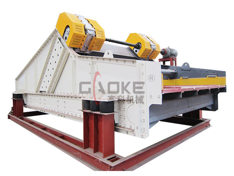 香蕉型振動篩篩箱近似于香蕉形狀,運動軌跡為橢圓,篩面擁有20°傾角,物料進入篩面后在振動力的作用下迅速前進、松散透篩,完成篩分作業(yè)。高科機械GKXJ系列香蕉型振動篩使用激振器作為振動源,激振力大小可調整,篩分精度高,處理能力強。